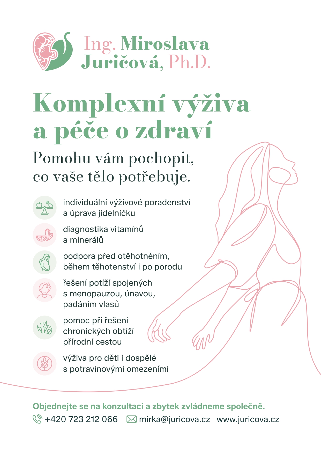 s potěšením oznamujeme spolupráci s paní Ing. Miroslavou Juričovou, Ph.D., specialistkou na výživu a komplexní péči o zdraví. Díky této spolupráci vám nyní můžeme nabídnout ještě ucelenější a odborně podloženou podporu na cestě ke zdraví, prevenci a rovnováze organizmu.